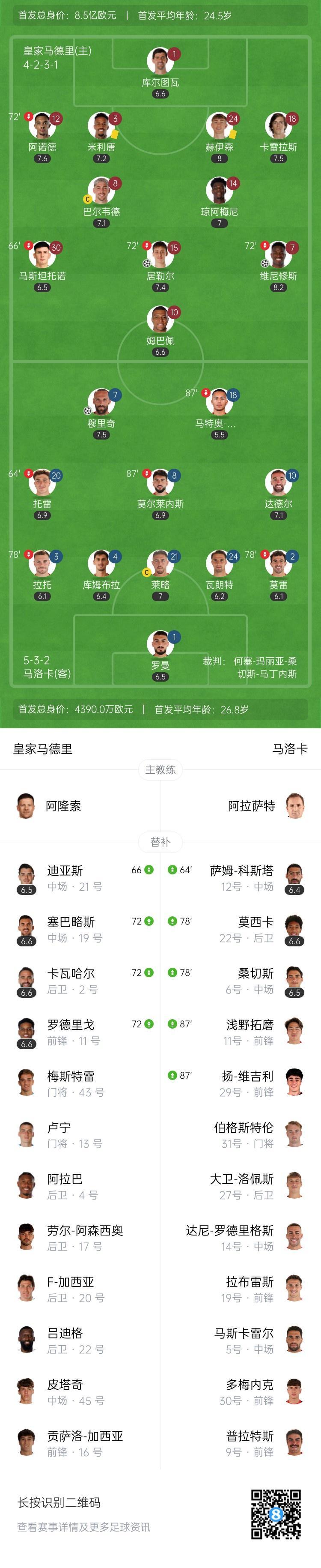 下半场补时6分钟。最终全场比赛结束,皇马2-1马洛卡。