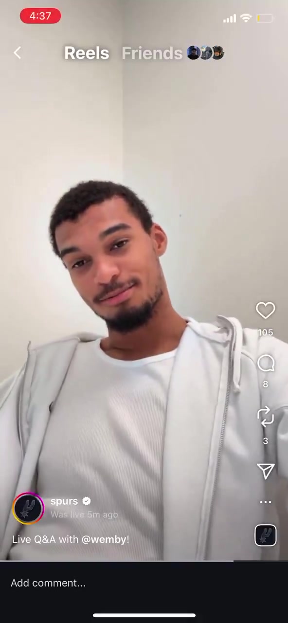09月10日讯 今日,马刺当家球星维克托-文班亚马在马刺官方ins账号上进行了直播。