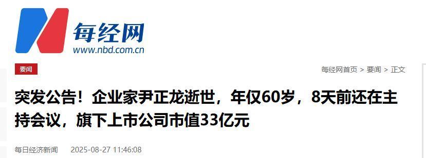 每日经济新闻2025-08-27 11:46:08突发公告!企业家尹正龙逝世,年仅60岁,8天前还在主持会议,旗下上市公司市值33亿元